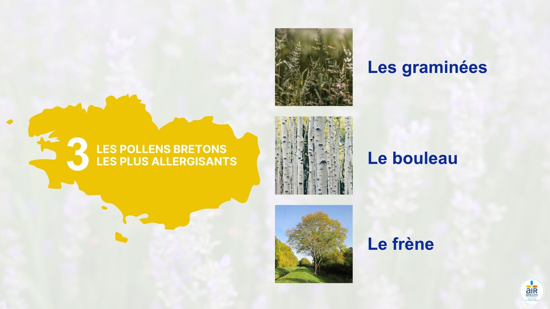 Ces trois pollens sont ceux qui, en général, causent le plus de symptômes chez les personnes sensibles en Bretagne. (Cette liste est une adaptation locale basée sur les niveaux allergiques les plus élevés dans la région.)