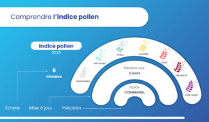 L’indice pollen est un indicateur journalier synthétique qui qualifie les évènements polliniques, à l’échelle communale pour la France métropolitaine et la Corse. Accessible et simplifiée sur une carte de prévision modélisée c’est une information importante pour les personnes allergiques, leur permettant de connaître la présence actuelle de pollens dans l’air mais aussi par anticipation pour les jours suivants (demain et après-demain). L’indice pollen permet aux personnes sensibles d’adapter leurs traitements et leurs comportements, afin de maîtriser leur exposition et réduire les symptômes de l’allergie.