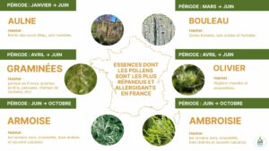 Ces taxons font partie des essences dont les pollens sont les plus répandus et allergisants en France métropolitaine. D’autres espèces viendront compléter l’information au fur et fur à mesure de leur prise en compte en modélisation atmosphérique.